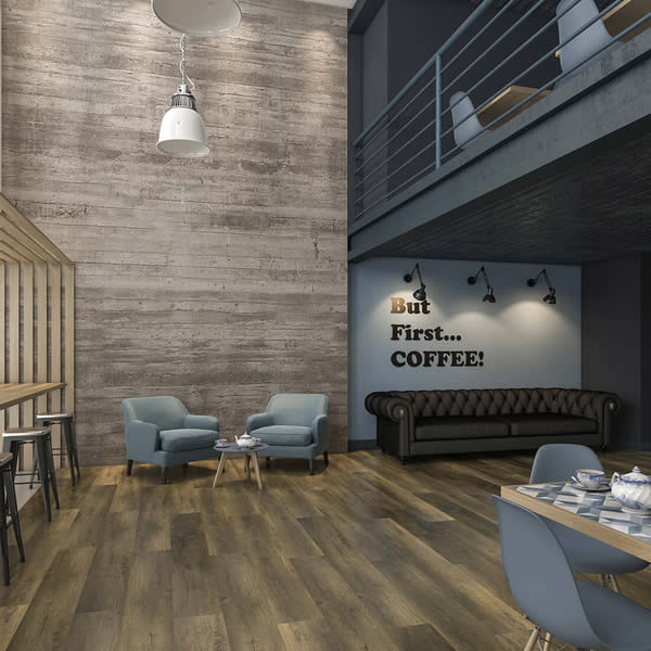 Piso LVT autoportante de última geração, cores que remetem à madeira de demolição. Devido à flexibilidade e a alta resistência, é indicado para piso elevado, o que confirma a funcionalidade e a segurança para ambientes despojados.