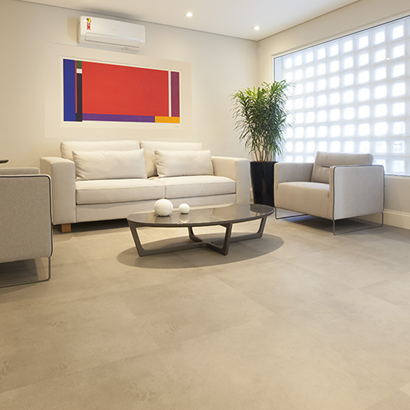 Em placas de 60 cm x 60 cm, a coleção apresenta texturas que vão do cimento queimado ao mármore. Tendência internacional de decoração, é indicado para ambientes de tráfego intenso.